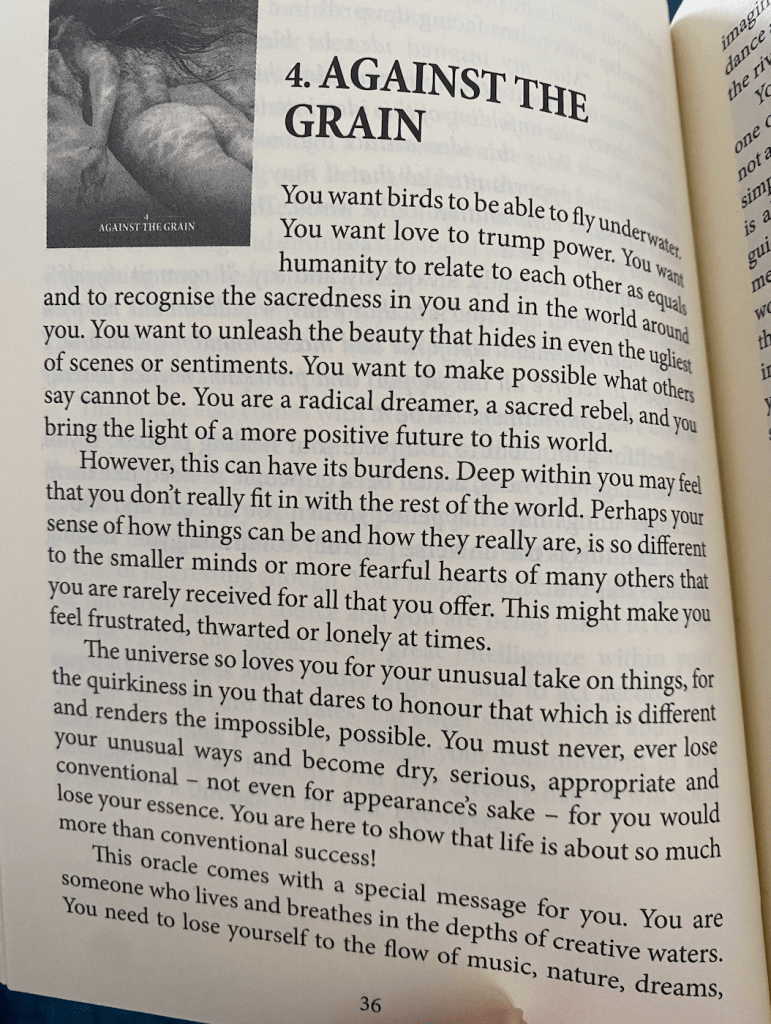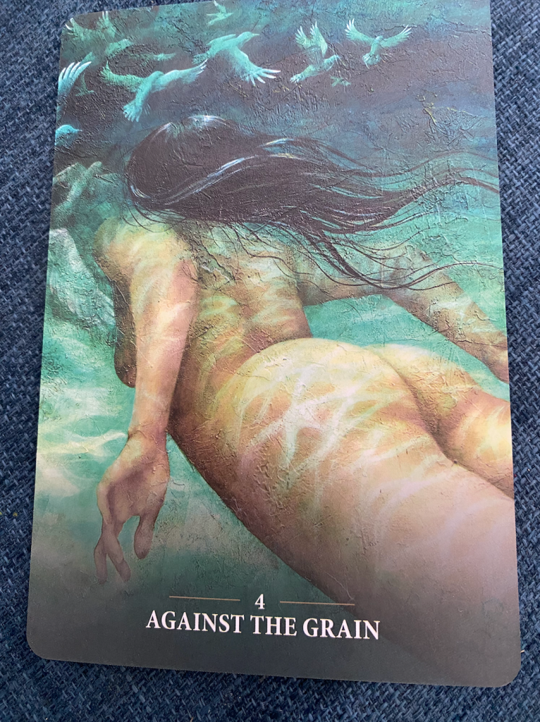 I pulled us an oracle card in ceremony from the sacred Rebels Oracle by Alana Fairchild and I kid you not, it was the same card as I pulled for us at last community ceremony in Jan 2023! The card was “going against the grain” – see image and description below. This is THE card for us. It is so so apt and resonates HARD 🙂